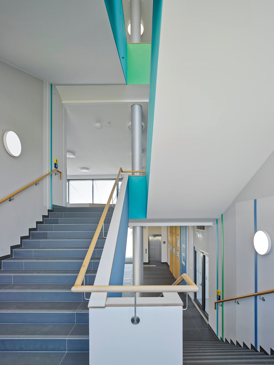 Ein Veranstaltungssaal und eine Cafeteria runden das Angebot ab. Den Nutzern stehen etwa 200 oberirdische Parkplätze und eine Tiefgarage zur Verfügung. Eine prägnante Verkleidung mit Eternittafeln und farbigen Elementen bestimmt die Fassade. Diese Motive finden sich auch in den Innenräumen wieder. Großen Wert wird auf eine hohe Aufenthaltsqualität gelegt.